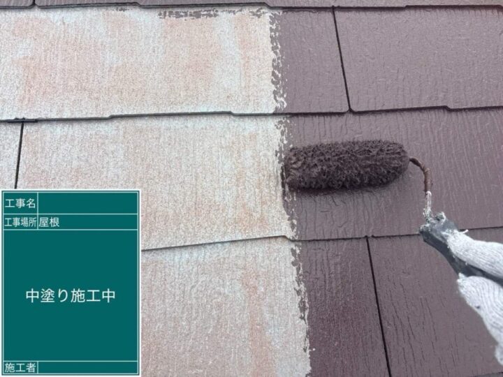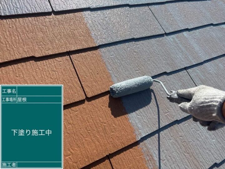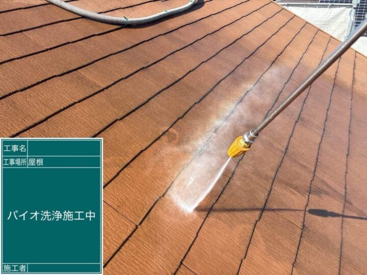 屋根のカビやコケなどの汚れを高圧洗浄機で取り除いてから塗装の工程に入ります(=゚ω゚)ノ下塗り