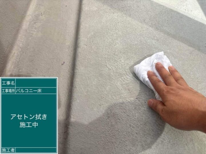 残ったウレタン層とプライマー層を除去し、コンクリートの健全層を露出することで新しい防水層施工が可能となります(。•ω- 。)アセトン拭き