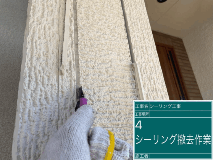カッターで切れ目を入れ、手やペンチで古くなった既存のコーキング材を撤去します!