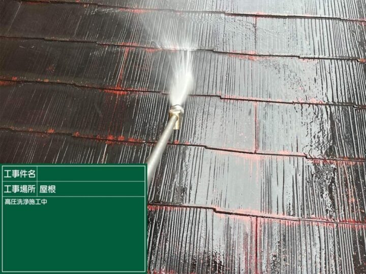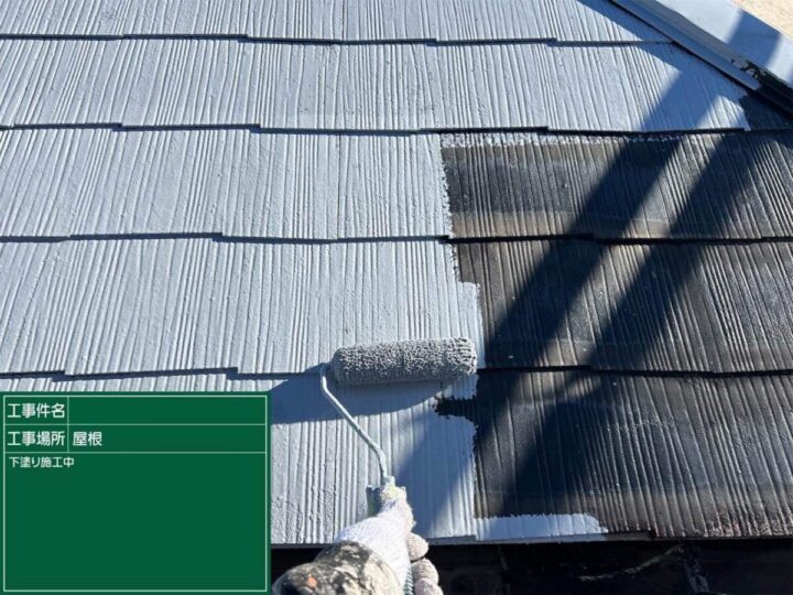 屋根のカビやコケなどの汚れを高圧洗浄機で取り除いてから塗装の工程に入ります(=゚ω゚)ノ下塗り