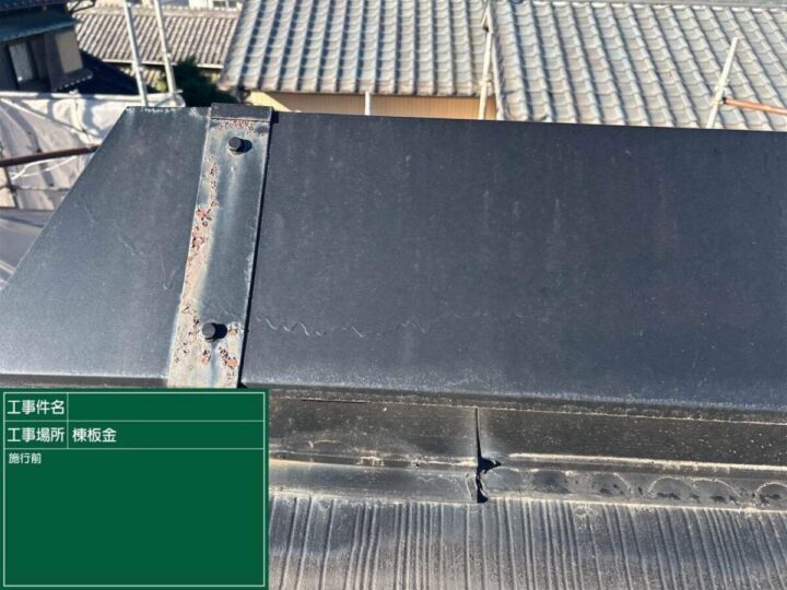 貫板の上から棟板金を被せ、釘やビスでしっかりと固定します!棟板金 塗装施工前