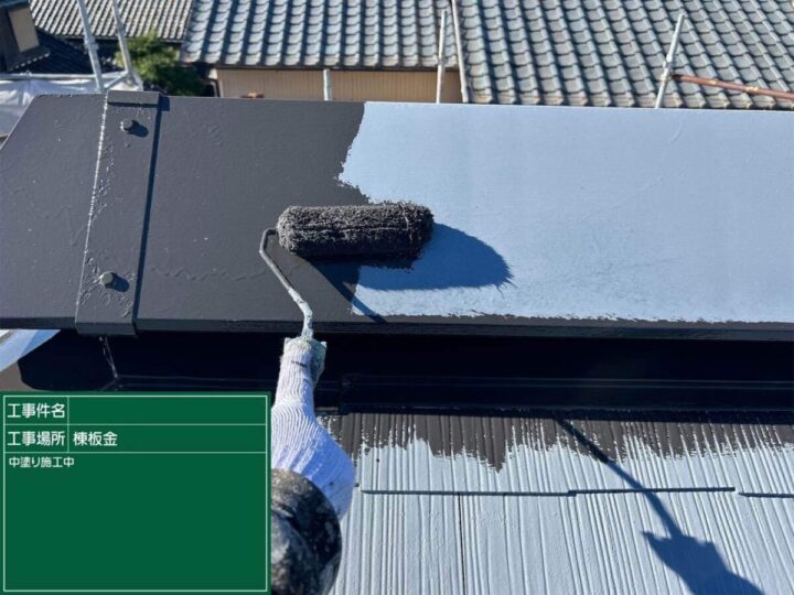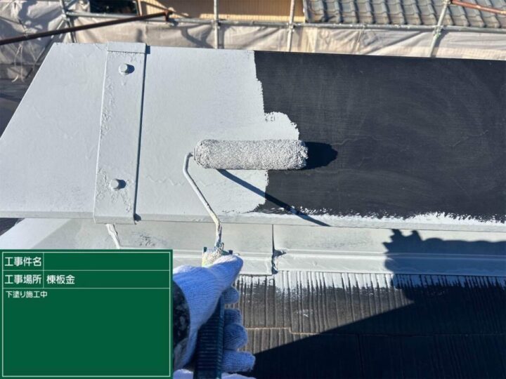まずは屋根と同様、下塗りから塗っていきます。棟板金 中塗り