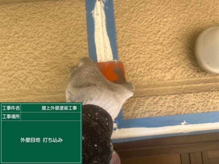 目地内に間隙なく充填するためヘラで抑え込みます!!