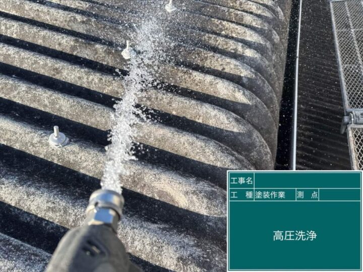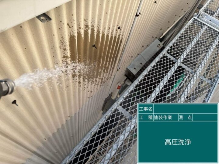汚れが残っている状態の上に塗装を行ってもきちんと密着しないため、高圧洗浄で綺麗に洗い流しておく必要があります!!