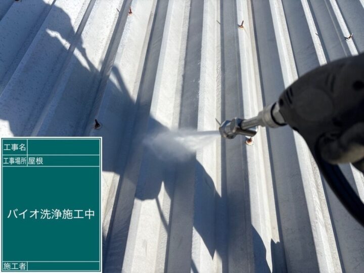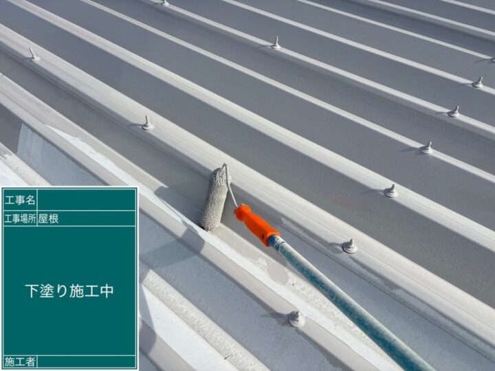 屋根のカビやコケなどの汚れを高圧洗浄機で取り除いてから塗装の工程に入ります(=゚ω゚)ノ下塗り