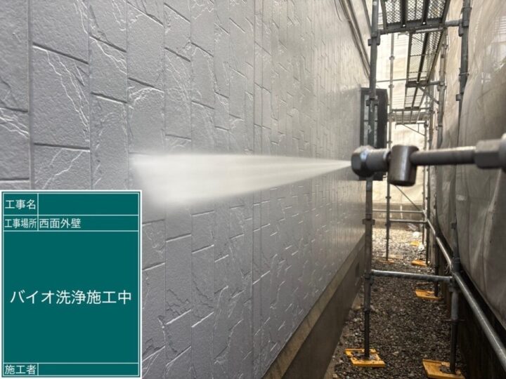 汚れが残っている状態の上に塗装を行ってもきちんと密着しないため、高圧洗浄で綺麗に洗い流しておく必要があります!!