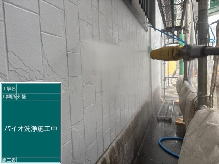 汚れが残っている状態の上に塗装を行ってもきちんと密着しないため、高圧洗浄で綺麗に洗い流しておく必要があります!!